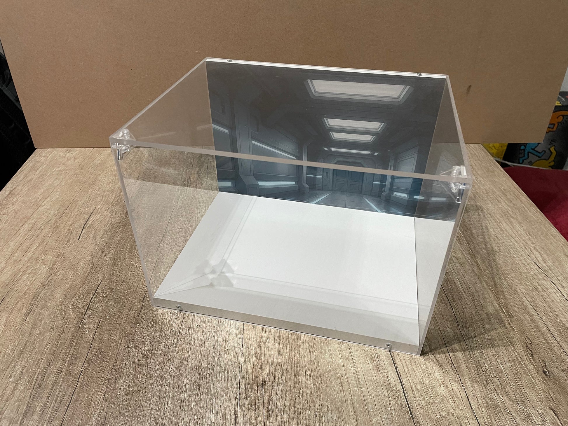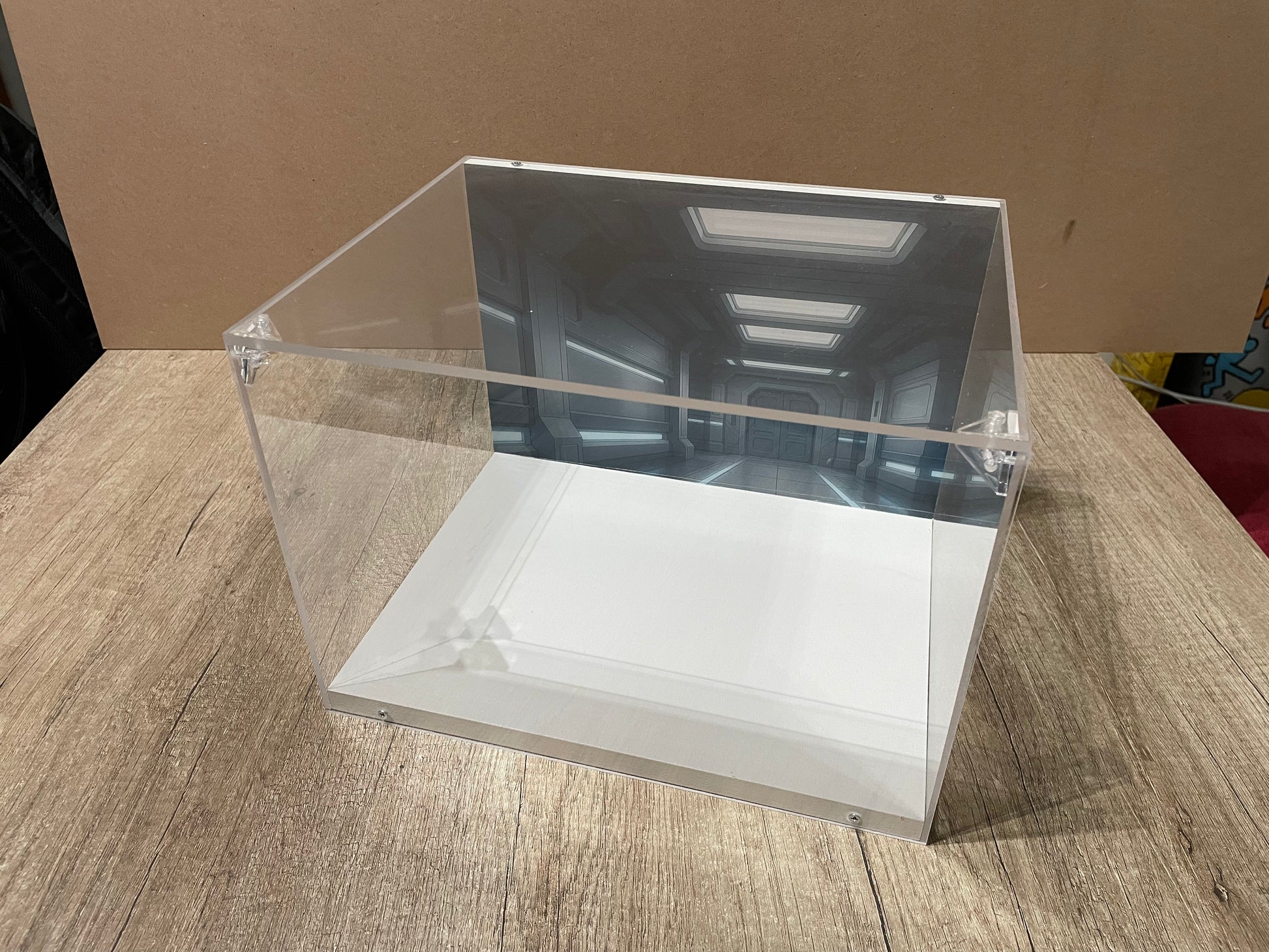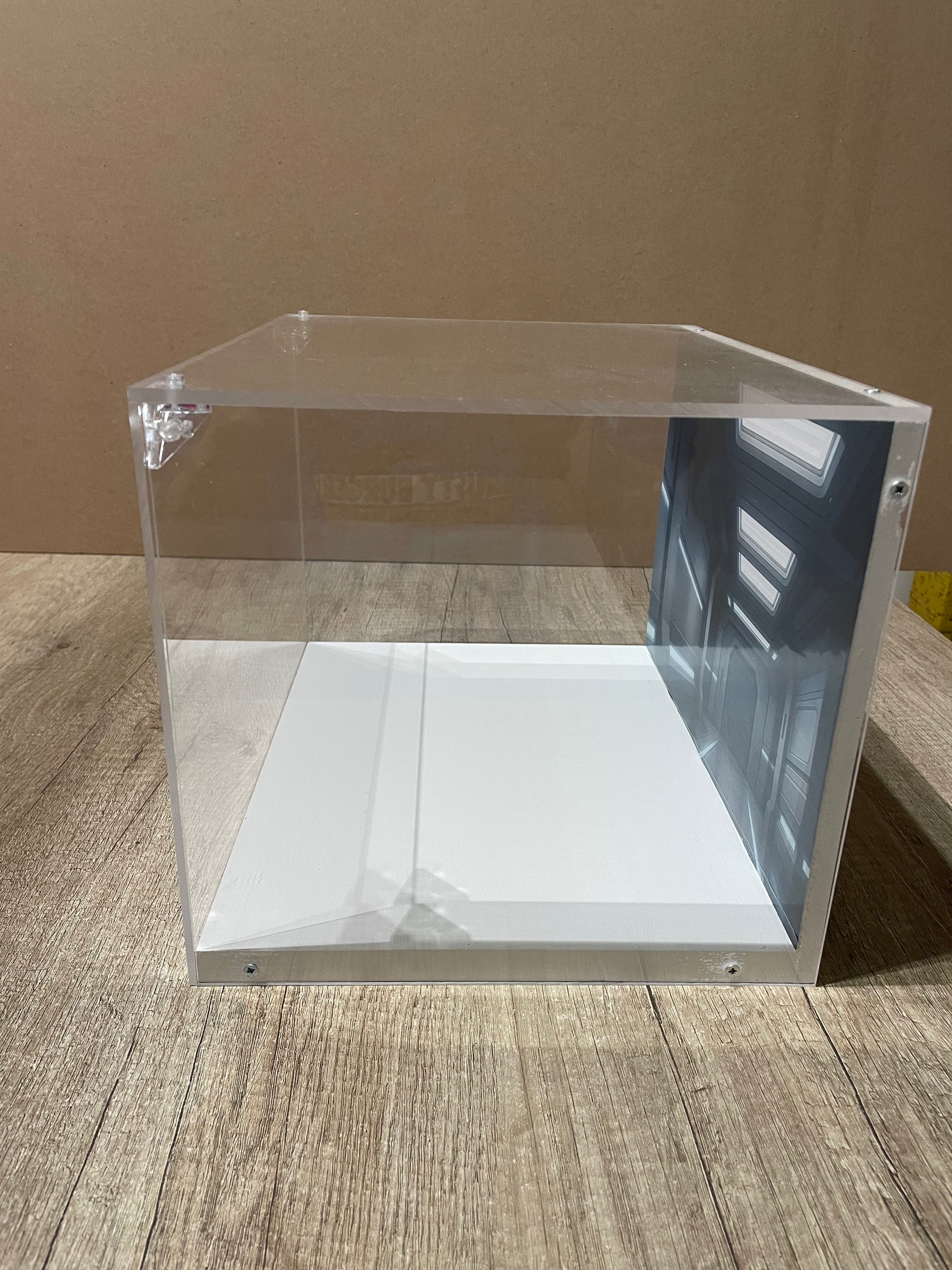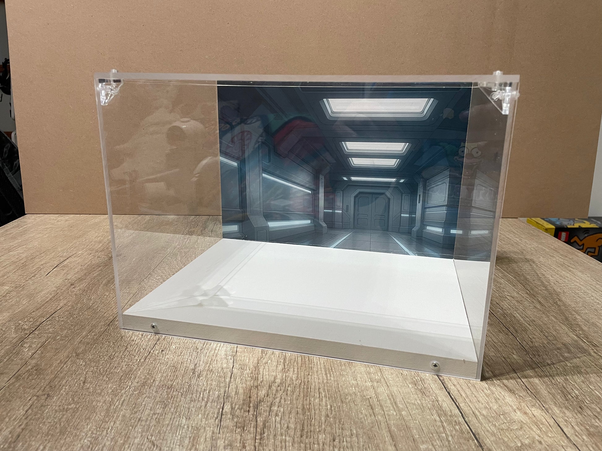 Il fondale stampato, personalizzabile, valorizza il modello esposto creando un effetto scenografico pulito ed elegante, ideale per set LEGO e oggetti da collezione.